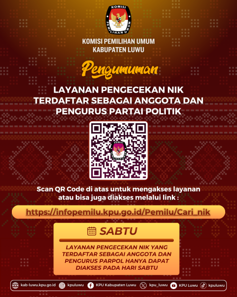 Ayo Cek Nik !! Masyarakat dapat mengecek NIK yang terdaftar sebagai anggota atau pengurus partai politik secara mandiri melalui layanan daring KPU!