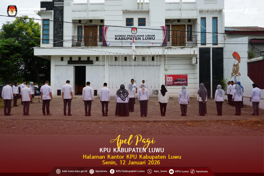 Luwu, kab-luwu.kpu.go.id, Komisi Pemilihan Umum (KPU) Kabupaten Luwu melaksanakan kegiatan apel pagi pada Senin, 12 Januari 2026, bertempat di halaman Kantor KPU Kabupaten Luwu. Apel pagi ini diikuti oleh seluruh jajaran KPU Kabupaten Luwu, baik komisioner maupun sekretariat, sebagai bagian dari upaya pembinaan kedisiplinan dan peningkatan etos kerja.