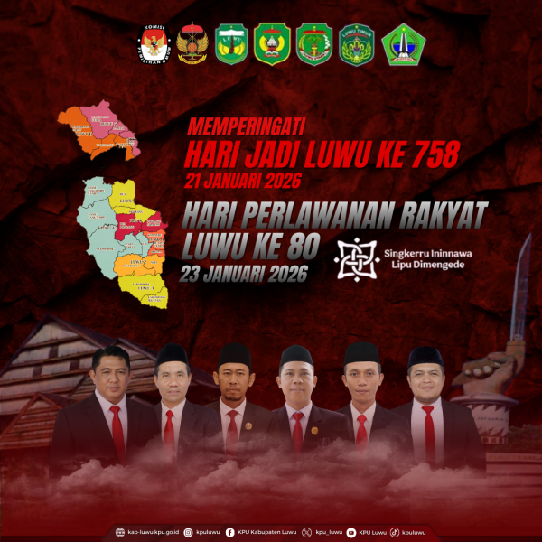 Komisi Pemilihan Umum Kabupaten Luwu mengajak seluruh elemen masyarakat untuk menjadikan Hari Jadi Kabupaten Luwu sebagai refleksi bersama dalam memperkokoh komitmen demokrasi yang berintegritas, jujur, dan adil demi terwujudnya Luwu yang berdaulat, maju, dan berkelanjutan.