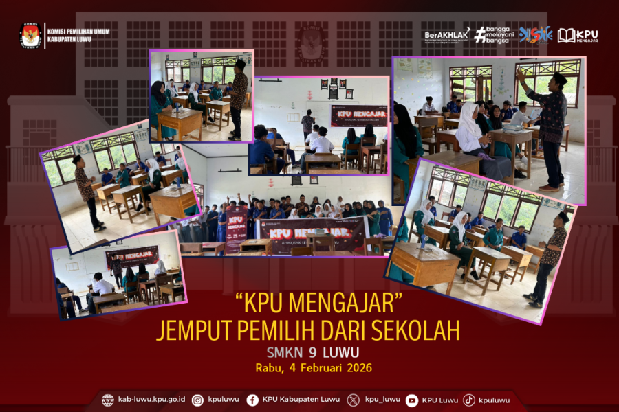 Komisi Pemilihan Umum Kabupaten Luwu melaksanakan kegiatan “KPU Mengajar: Jemput Pemilih dari Sekolah” pada Rabu, 4 Februari 2026, bertempat di SMKN 9 Luwu. Kegiatan ini merupakan bagian dari program pendidikan pemilih yang bertujuan meningkatkan pemahaman dan kesadaran politik, khususnya bagi pemilih pemula, agar mampu menggunakan hak pilihnya secara cerdas dan bertanggung jawab.