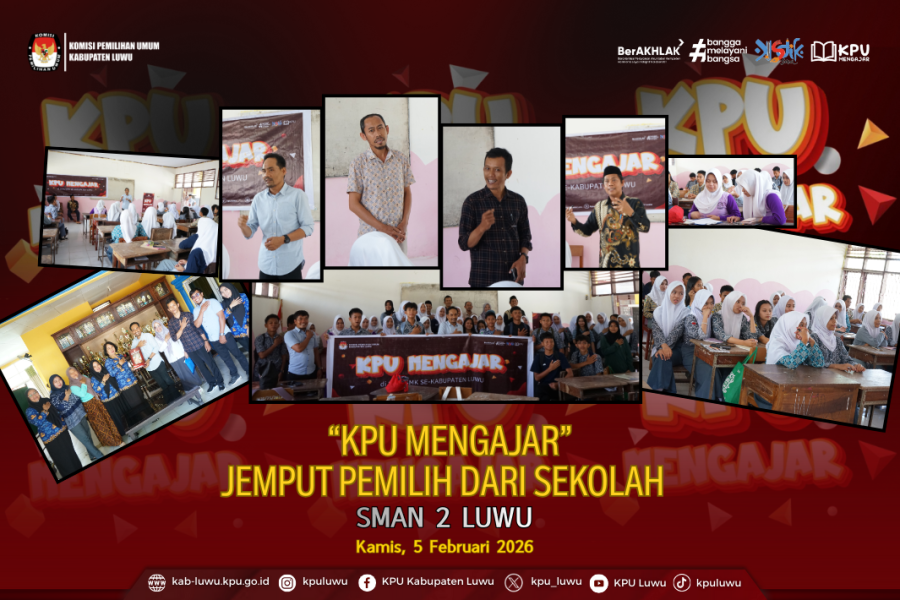 Luwu. Kab-luwu.kpu.go.id, Komisi Pemilihan Umum (KPU) Kabupaten Luwu melaksanakan kembali kegiatan KPU Mengajar “Jemput Pemilih dari Sekolah” di SMAN 2 Luwu sebagai bagian dari upaya pendidikan pemilih dan peningkatan partisipasi politik bagi pemilih pemula. Kegiatan ini bertujuan untuk memberikan pemahaman kepada siswa-siswi tentang pentingnya pemilu, peran strategis generasi muda dalam demokrasi, serta tahapan dan teknis penyelenggaraan pemilihan umum.
