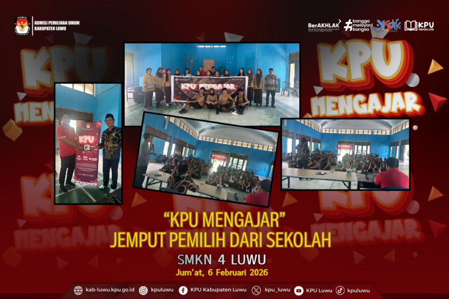 Komisi Pemilihan Umum (KPU) Kabupaten Luwu melaksanakan kegiatan KPU Mengajar “Jemput Pemilih dari Sekolah” pada Jum’at, 6 Februari 2026, bertempat di SMKN 4 Luwu. Kegiatan ini merupakan bagian dari upaya KPU Kabupaten Luwu dalam meningkatkan pendidikan pemilih, khususnya bagi pemilih pemula, sekaligus menumbuhkan kesadaran berdemokrasi sejak usia sekolah.
