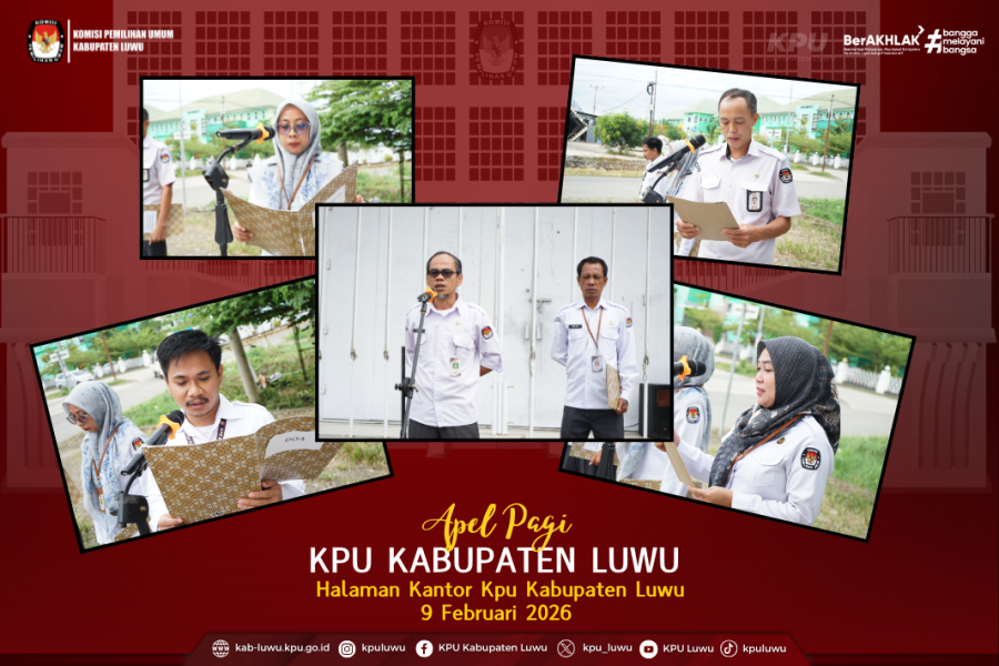 Luwu, Kab-luwu.kpu.go.id, Komisi Pemilihan Umum Kabupaten Luwu melaksanakan kegiatan apel pagi pada hari Senin, 9 Februari 2026, bertempat di halaman Kantor KPU Kabupaten Luwu. Apel pagi ini diikuti oleh seluruh jajaran sekretariat sebagai bentuk komitmen dalam membangun disiplin, tanggung jawab, serta semangat kerja di lingkungan KPU Kabupaten Luwu.