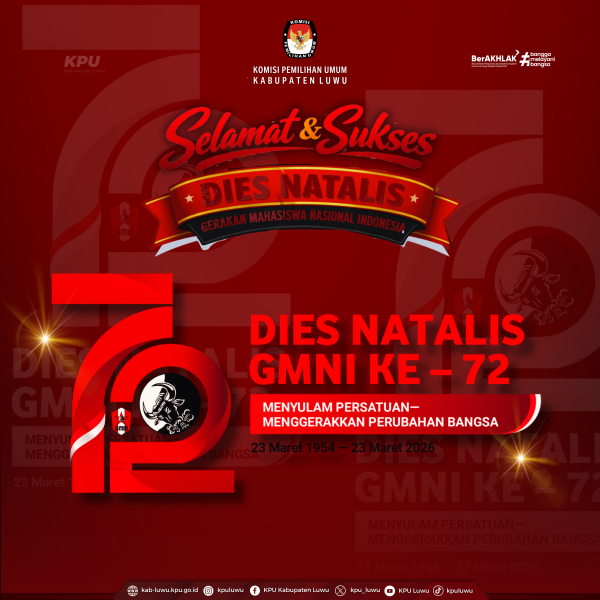 Luwu, Kab-luwu.kpu.go.id, Segenap Jajaran Komisi Pemilihan Umum Kabupaten Luwu dengan penuh rasa hormat dan kebanggaan mengucapkan Selamat dan Sukses atas peringatan Dies Natalis ke-72 Gerakan Mahasiswa Nasional Indonesia yang jatuh pada tanggal 23 Maret 2026.