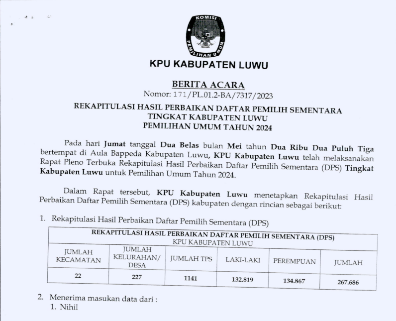 Berita Acara dan Keputusan Penetapan Rekapitulasi Daftar Pemilih Sementara Hasil Perbaikan (DPSHP) Kabupaten Luwu
