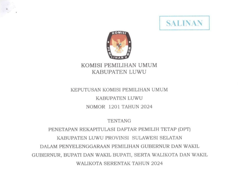 Berita Acara dan Keputusan Penetapan Rekapitulasi Daftar Pemilih Tetap (DPT) Kabupaten Luwu Pemilihan Serentak Tahun 2024