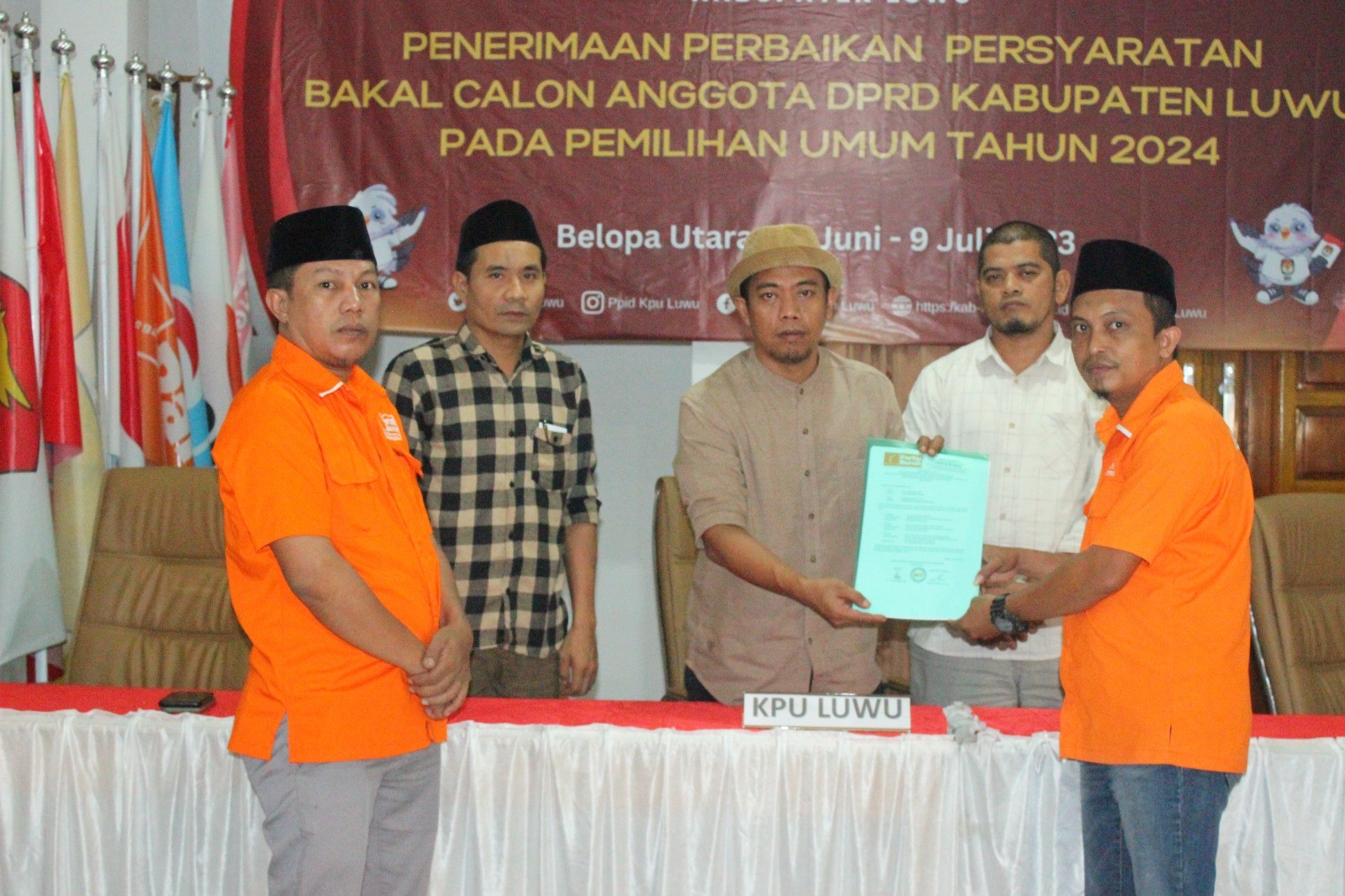 Delegasi partai diterima oleh Ketua KPU Luwu Hasan Sufyan, Anggota KPU Luwu Abdullah Sappe Ampin Maja, Adly Aqsha, dan Muhammad Samsir G. serta disaksikan oleh Bawaslu Luwu di Ruang Media Center KPU Luwu.