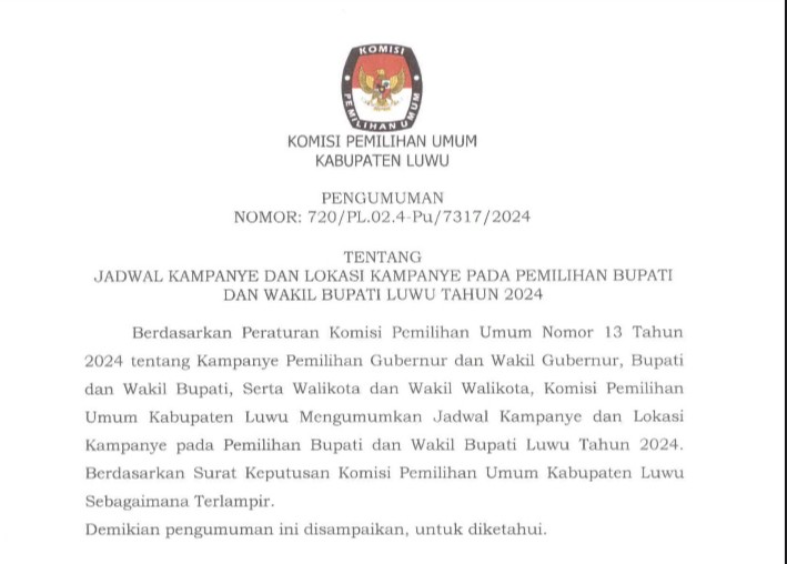 Jadwal Kampanye dan Lokasi Kampanye pada Pemilihan Bupati dan Wakil Bupati Luwu Tahun 2024