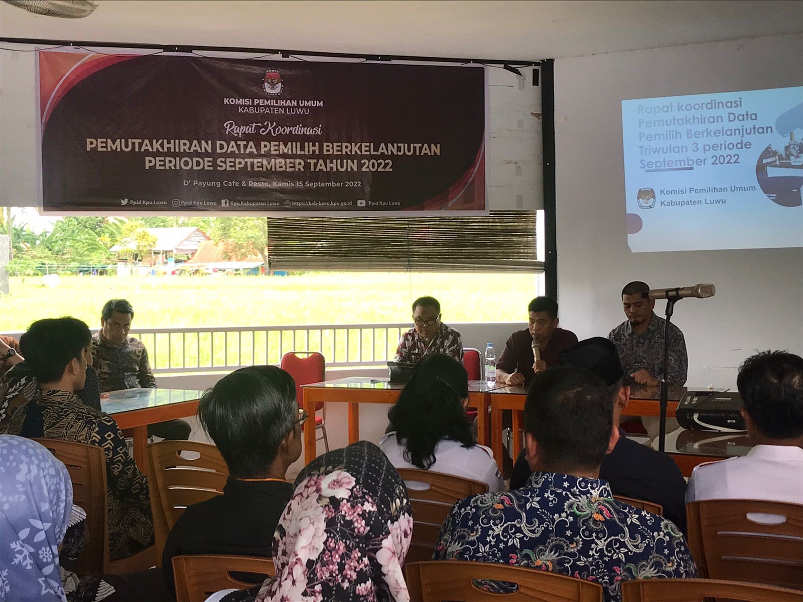 Luwu - Menindaklanjuti Peraturan KPU Nomor 6 Tahun 2021 pasal 27 tentang Pemutakhiran Data Pemilih Berkelanjutan (PDPB), KPU Kabupaten Luwu menggelar kegiatan Rapat Koordinasi Rekapitulasi PDPB Triwulan III Periode September Tahun 2022.