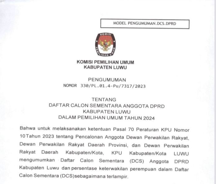 Pengumuman Daftar Calon Sementara (DCS) Anggota DPRD Kabupaten Luwu Pemilu Tahun 2024 Nomor: 330/PL.1.04-Pu/7317/2023