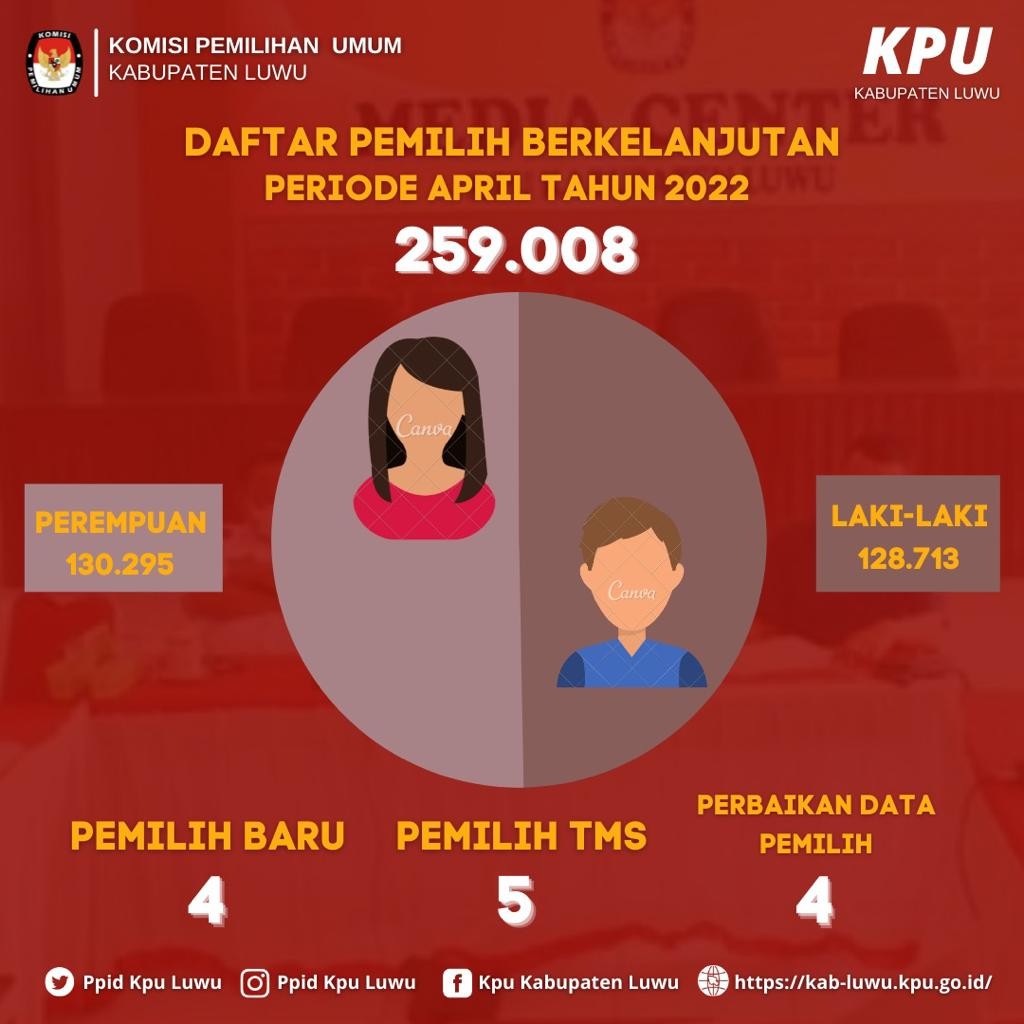 Hasil Rekapitulasi Ulang Daftar Pemilih Berkelanjutan Tahun 2022 untuk periode Bulan April di Kabupaten Luwu sebanyak 259.008 dengan rincian pemilih laki-laki berjumlah 128.713 pemilih dan pemilih perempuan 130.295 pemilih.