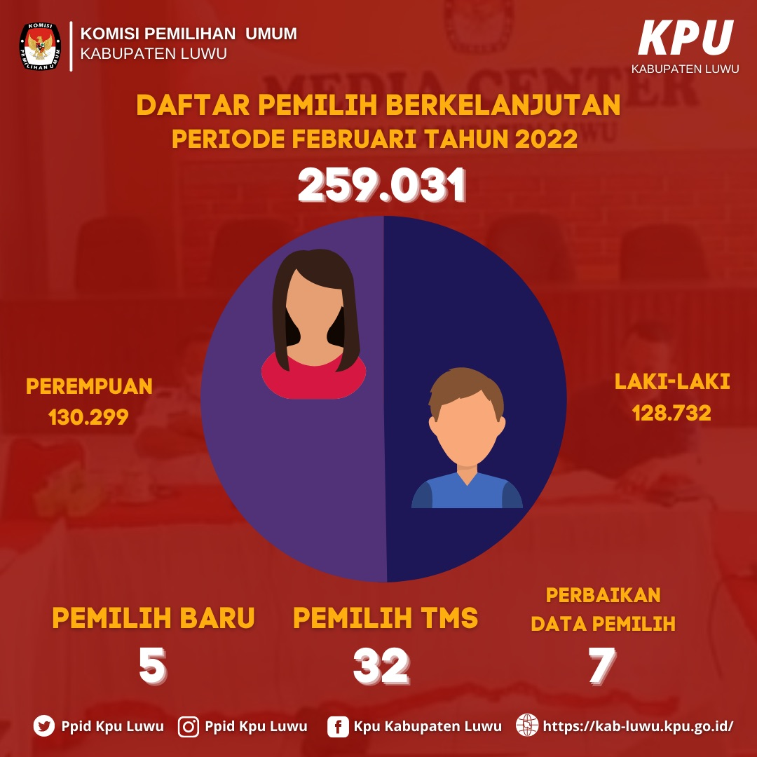 Hasil Rekapitulasi Ulang Daftar Pemilih Berkelanjutan Tahun 2022 untuk periode Bulan Februari di Kabupaten Luwu sebanyak 259.031 dengan rincian pemilih laki-laki berjumlah 128.732 pemilih dan pemilih perempuan 130.299 pemilih.