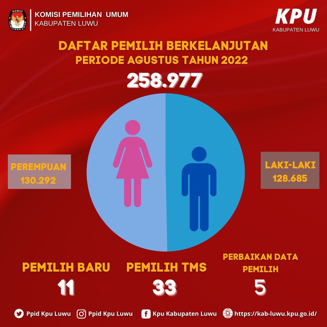Hasil Rekapitulasi Ulang Daftar Pemilih Berkelanjutan Tahun 2022 untuk periode Bulan Agustus di Kabupaten Luwu sebanyak 258.977 dengan rincian pemilih laki-laki berjumlah 128.685 pemilih dan pemilih perempuan 130.292 pemilih.