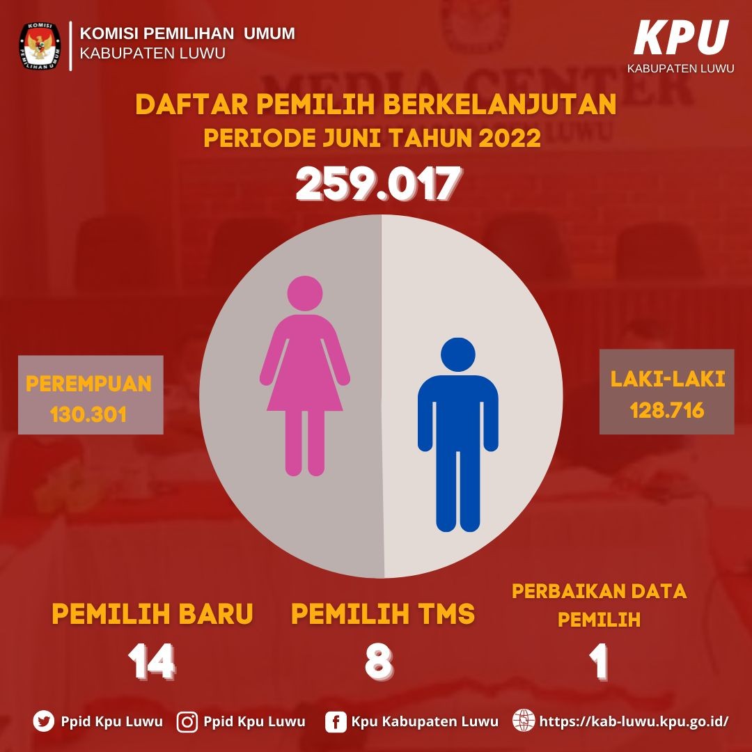 Hasil Rekapitulasi Ulang Daftar Pemilih Berkelanjutan Tahun 2022 untuk periode Bulan Juni di Kabupaten Luwu sebanyak 259.017 dengan rincian pemilih laki-laki berjumlah 128.716 pemilih dan pemilih perempuan 130.301 pemilih.