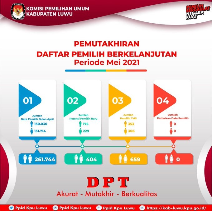 Daftar Perubahan Pemilih Hasil Pemutakhiran Daftar Pemilih Berkelanjutan (PDPB) Bulan Mei Tahun 2021 Kabupaten Luwu by name bisa diakses melalui https://bit.ly/BeritaAcaraDPBLuwuMei