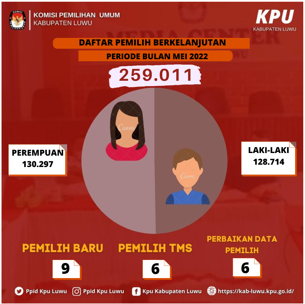 Hasil Rekapitulasi Ulang Daftar Pemilih Berkelanjutan Tahun 2022 untuk periode Bulan Mei di Kabupaten Luwu sebanyak 259.011 dengan rincian pemilih Laki-laki berjumlah 128.714 pemilih dan pemilih Perempuan 130.297 pemilih.