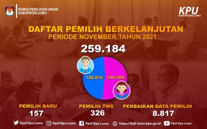 Daftar Perubahan Pemilih Hasil Pemutakhiran Daftar Pemilih Berkelanjutan (PDPB) Bulan November Tahun 2021 Kabupaten Luwu by name bisa diakses via https://bit.ly/PDPBLuwuNovember2021