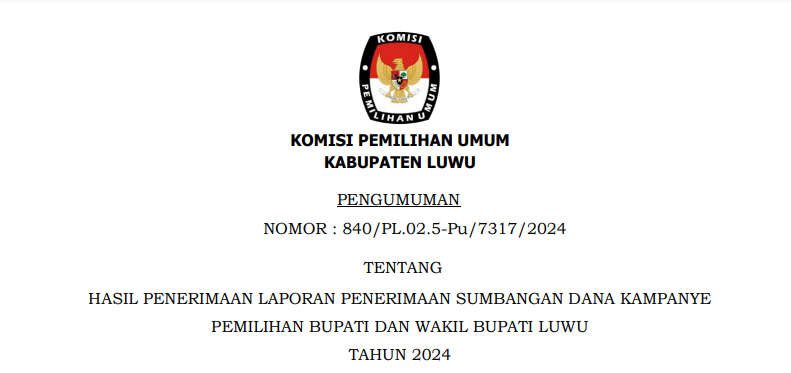 Pengumuman Hasil Penerimaan Laporan Penerimaan Sumbangan Dana Kampanye Pemilihan Bupati Dan Wakil Bupati Luwu Tahun 2024