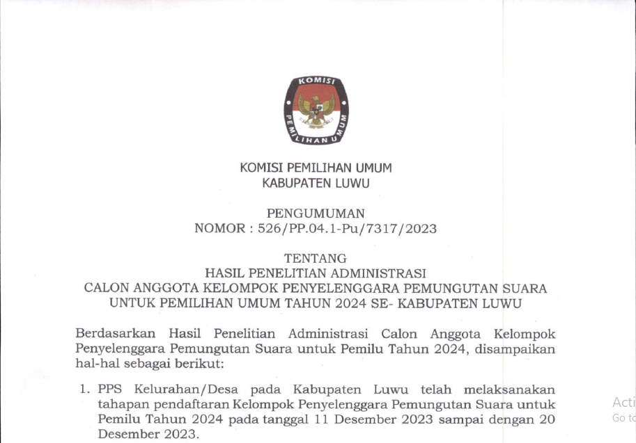 KPU Kabupaten Luwu dengan ini menyampaikan kepada masyarakat Pengumuman Hasil Seleksi Administrasi Calon Anggota Kelompok Penyelenggara Pemungutan Suara (KPPS) untuk Pemilu Tahun 2024 Kabupaten Luwu Nomor : 526/PP.04.1-Pu/7317/2023, tanggal 25 Desember 2023. Untuk selengkapnya isi Pengumuman Hasil Seleksi Administrasi Calon Anggota Kelompok Penyelenggara Pemungutan Suara (KPPS) untuk Pemilu Tahun 2024 dapat dilihat melalui link https://bit.ly/PengumumanAdministrasiKPPSLuwu