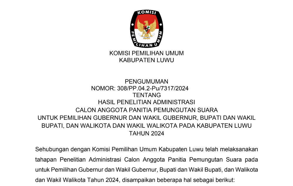 Pengumuman Hasil Seleksi Administrasi Calon Anggota PPS untuk Pilkada Serentak Kabupaten Luwu Tahun 2024