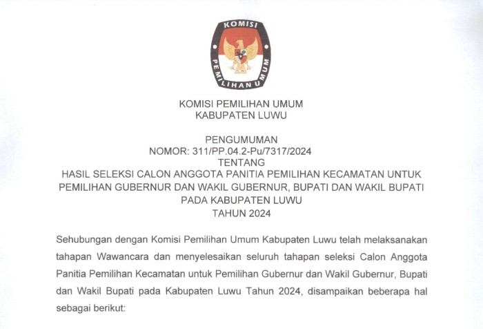 Pengumuman Hasil Seleksi Calon Anggota PPK untuk Pilkada Serentak Kabupaten Luwu Tahun 2024