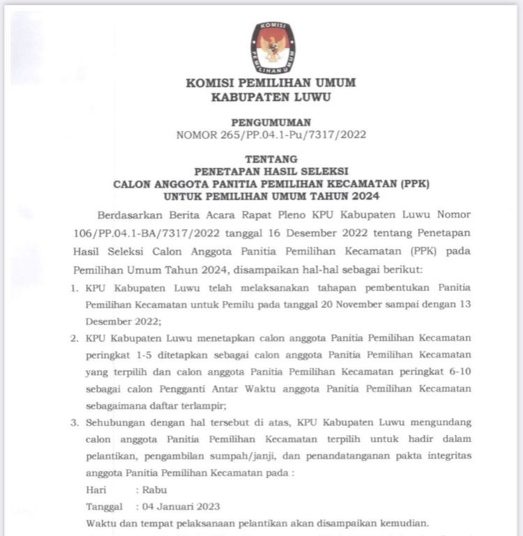 KPU Kabupaten Luwu dengan ini menyampaikan kepada masyarakat Pengumuman Tentang Hasil Seleksi Wawancara Calon Anggota Panitia Pemilihan Kecamatan (PPK) Pemilu Tahun 2024, Nomor : 265/PP.04.1-Pu/7317/2022, tanggal 16 Desember 2022. Untuk selengkapnya isi pengumuman Hasil Seleksi Wawancara Calon Anggota PPK dapat dilihat melalui link https://bit.ly/PengumumanSeleksiWawancaraPPKLuwu