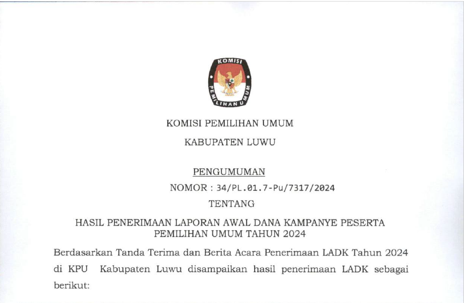 KPU Kabupaten Luwu dengan ini menyampaikan kepada masyarakat Pengumuman Laporan Awal Dana Kampanye (LADK) Partai Politik Tingkat Kabupaten Luwu untuk Pemilu Tahun 2024 Kabupaten Luwu Nomor : 34/PL.01.7-Pu/7317/2024, tanggal 8 Januari 2024. Untuk selengkapnya isi Pengumuman Laporan Awal Dana Kampanye (LADK) Partai Politik Tingkat Kabupaten Luwu dapat dilihat melalui link >> Laporan Awal Dana Kampanye (LADK) Partai Politik Tingkat Kab. Luwu