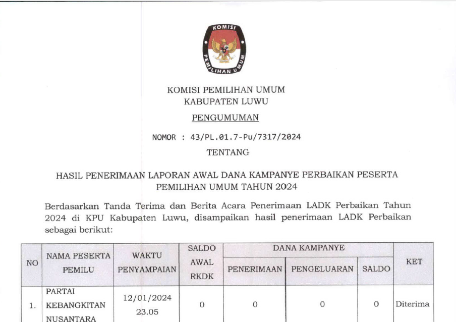 Pengumuman Laporan Awal Dana Kampanye (LADK) Perbaikan Partai Politik Tingkat Kabupaten Luwu