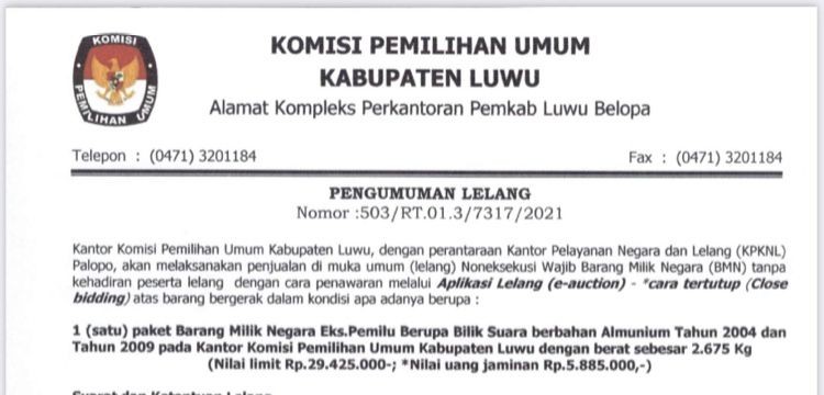 KPU Kabupaten Luwu dengan ini menyampaikan kepada masyarakat Pengumuman Lelang, Nomor : 503/RT.01.3/7317/2021, tanggal 17 Desember 2021. Untuk selengkapnya isi pengumuman lelang dapat dilihat melalui link https://bit.ly/PengumumanLelangBMNEksPemilu