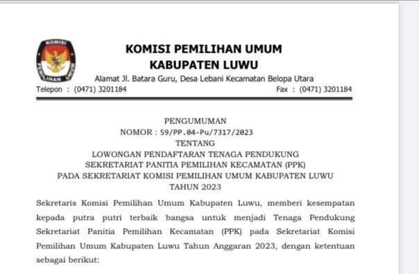 Pengumuman Lowongan Pendaftaran Tenaga Pendukung Sekretariat PPK Pada Sekretariat KPU Kabupaten Luwu Nomor : 059/PP.04-Pu/7317/2023