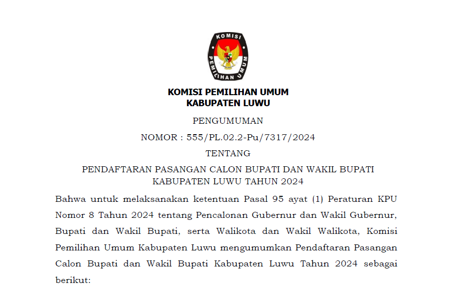 Pengumuman Pendaftaran Pasangan Calon Bupati dan Wakil Bupati Kabupaten Luwu Tahun 2024