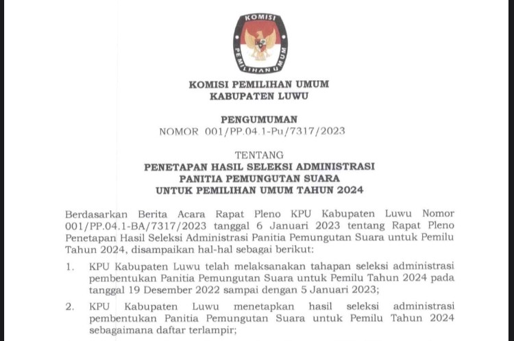 KPU Kabupaten Luwu dengan ini menyampaikan kepada masyarakat Pengumuman Penetapan Hasil Seleksi Admnistrasi Panitia Pemungutan Suara (PPS) Pemilu Tahun 2024 Nomor: 001/PP.04.1-Pu/7317/2023, tanggal 6 Januari 2023. Untuk selengkapnya isi pengumuman Penetapan Hasil Seleksi Admnistrasi Panitia Pemungutan Suara (PPS) Pemilu Tahun 2024 dapat dilihat melalui link https://bit.ly/PengumumanSeleksiAdmPPSLuwu