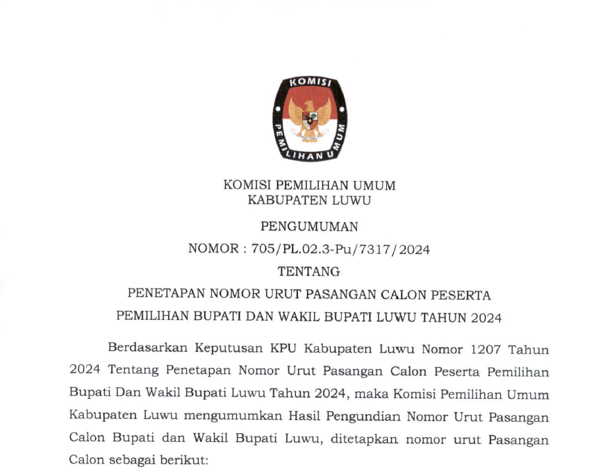 Pengumuman Penetapan Nomor Urut Pasangan Calon Peserta Pemilihan Bupati Dan Wakil Bupati Luwu Tahun 2024