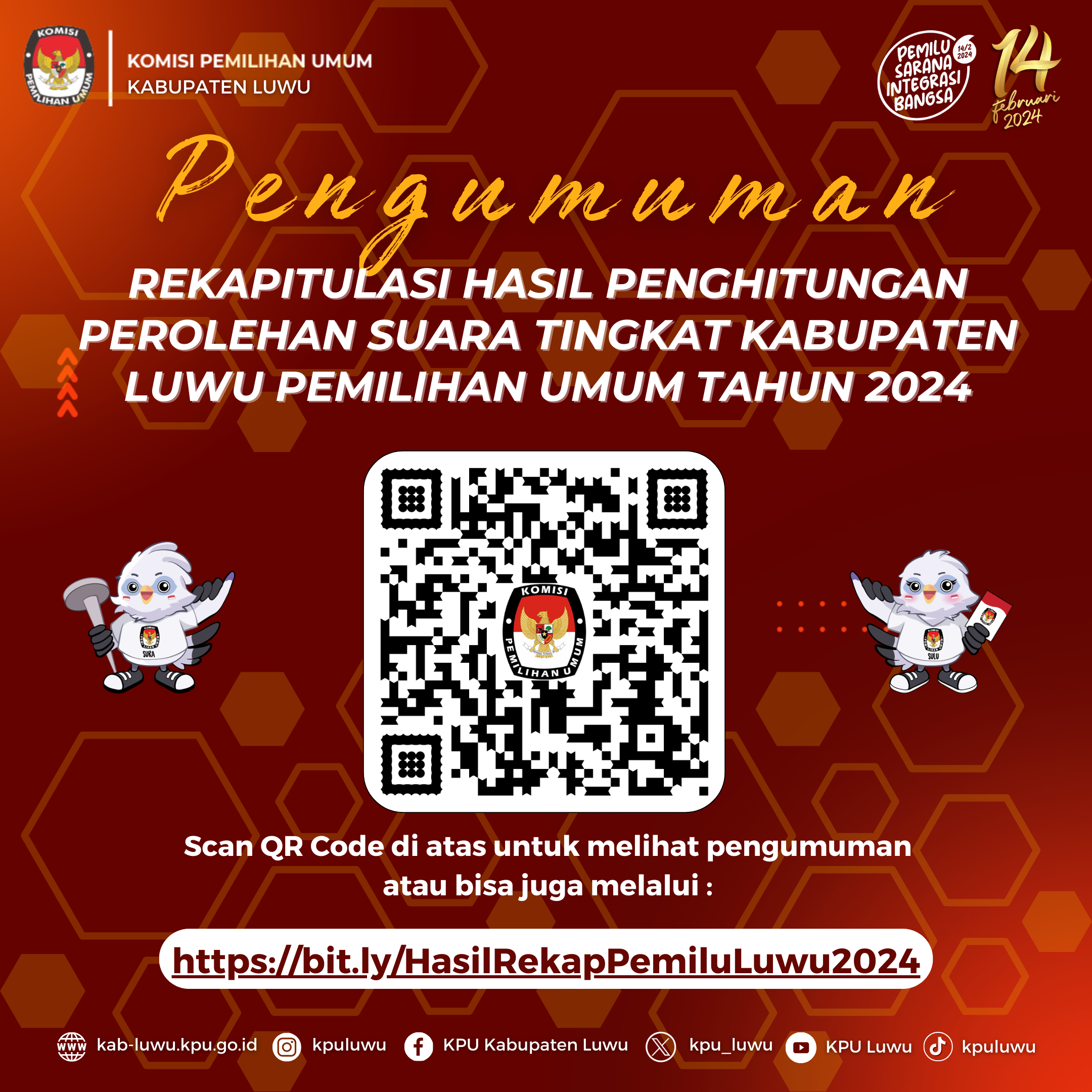 KPU Kabupaten Luwu dengan ini menyampaikan kepada masyarakat Pengumuman Rekapitulasi Penghitungan Perolehan Suara Tingkat Kabupaten Luwu untuk Pemilu Tahun 2024 tanggal 4 Maret 2024. Untuk selengkapnya isi Pengumuman Rekapitulasi Penghitungan Perolehan Suara Tingkat Kabupaten Luwu untuk Pemilu Tahun 2024 dapat dilihat melalui link >> https://bit.ly/HasilRekapPemiluLuwu2024