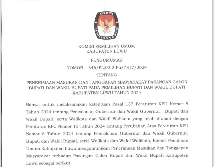 PENGUMUMUMAN PENERIMAAN MASUKAN DAN TANGGAPAN MASYARAKAT PASANGAN CALON BUPATI DAN WAKIL BUPATI PADA PEMILIHAN BUPATI DAN WAKIL BUPATI KABUPATEN LUWU TAHUN 2024