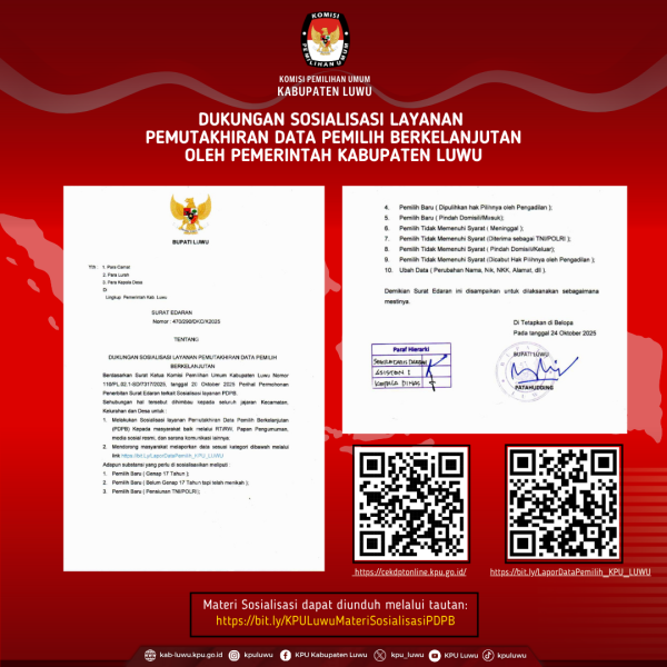 Luwu, kab-luwu.kpu.go.id. Pendapat Anda adalah kunci utama dalam mendukung terwujudnya Pelayanan Publik yang Bersih, Transparan, dan Berintegritas di Komisi Pemilihan Umum (KPU) Kabupaten Luwu. Survei Pembangunan Zona Integritas (ZI) ini bukan sekadar formalitas, melainkan alat penting bagi KPU Kabupaten Luwu untuk: Mengidentifikasi kelemahan dan potensi praktik maladministrasi atau korupsi. Meningkatkan kualitas layanan kepemiluan yang adil dan profesional. Memastikan bahwa setiap tahapan Pemilu dan Pilkada dilaksanakan dengan prinsip transparansi dan akuntabilitas. Mengapa Partisipasi Anda Penting? Suara Masyarakat adalah Kontrol: Penilaian Anda mencerminkan realitas pengalaman berinteraksi dengan KPU Luwu. Dengan memberikan masukan yang jujur, Anda berfungsi sebagai pengawas eksternal yang efektif. Mendukung Perubahan Positif: Setiap jawaban dan kritik konstruktif Anda membantu KPU Luwu merumuskan kebijakan dan perbaikan nyata untuk menghadirkan birokrasi yang bebas dari KKN (Korupsi, Kolusi, dan Nepotisme). Memperkuat Kepercayaan: KPU yang berintegritas adalah fondasi bagi demokrasi yang sehat. Kontribusi Anda secara langsung memperkuat kepercayaan publik terhadap penyelenggara Pemilu. Mari berpartisipasi aktif! Sampaikan pandangan Anda dengan objektif dan jujur. Dukungan Anda sangat berarti dalam menjadikan KPU Kabupaten Luwu sebagai lembaga yang melayani penuh integritas, demi terjaminnya hak politik dan masa depan demokrasi di Luwu. KPU Kabupaten Luwu mengajak seluruh masyarakat untuk berpartisipasi dalam Survei Pembangunan Zona Integritas. Pendapat Anda sangat berarti untuk mendukung pelayanan publik yang bersih, transparan, dan berintegritas. Yuk, isi surveinya melalui tautan : https://bit.ly/SurveiZonaIntegritasKPULuwu Bersama kita wujudkan KPU yang semakin akuntabel dan terpercaya. #KPULuwu #ZonaIntegritas #WilayahBebasKorupsi #PelayananPublik #SurveiKPU